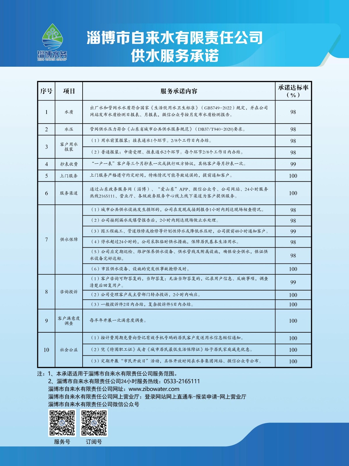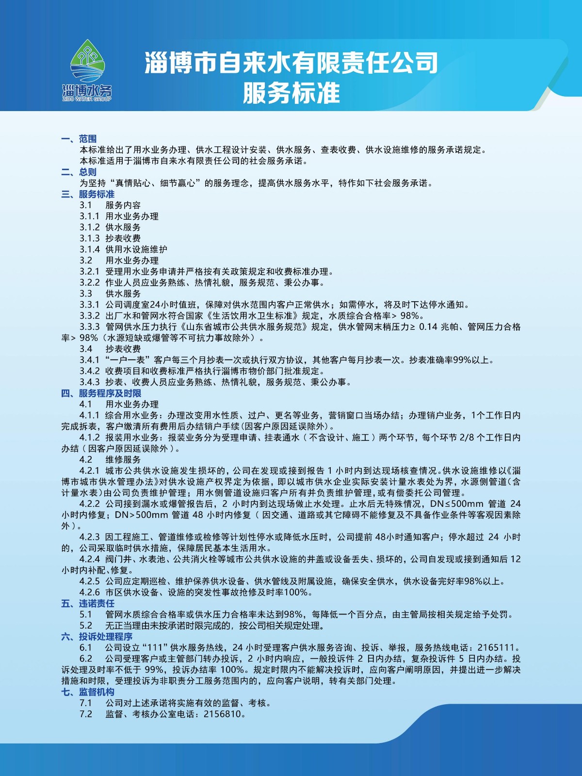淄博市自来水有限责任公司供水服务标准、服务承诺